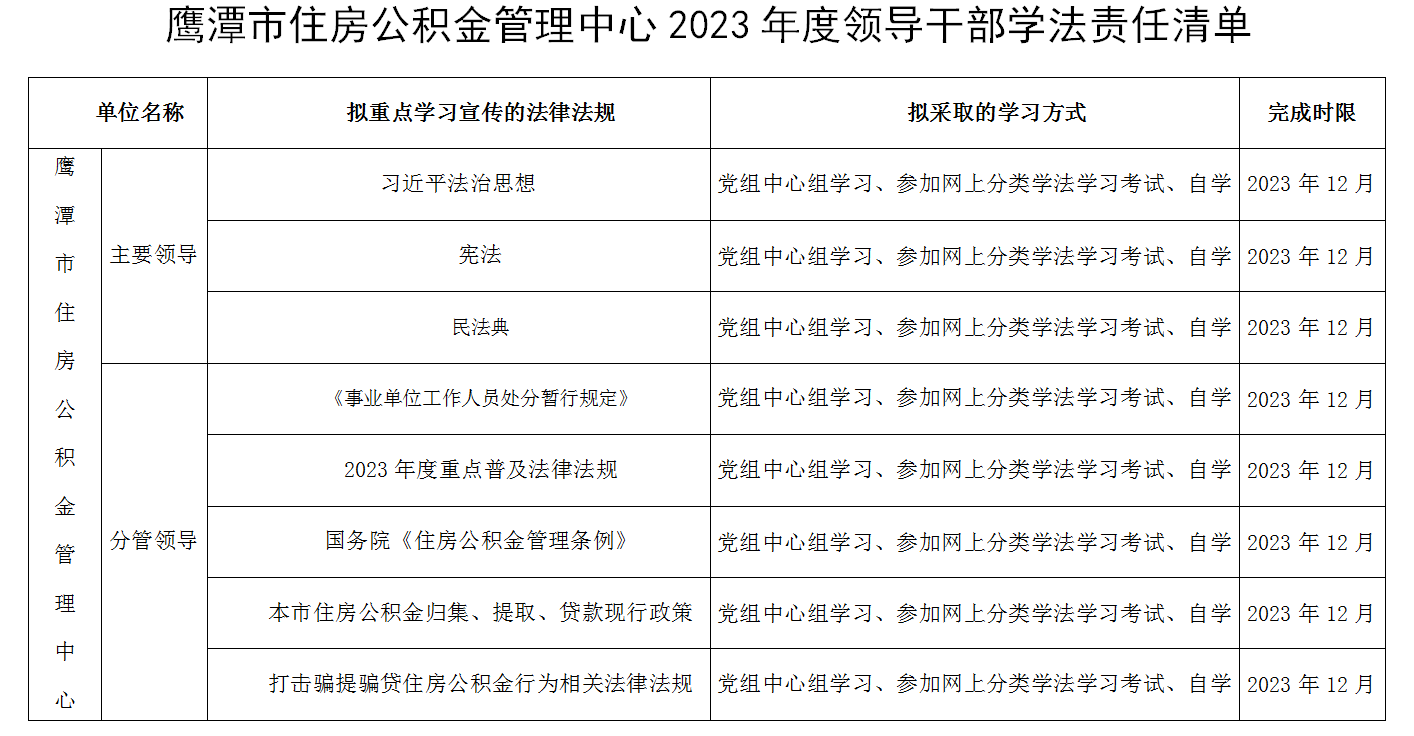 鹰潭市住房公积金管理中心2023年度领导干部学法责任清单