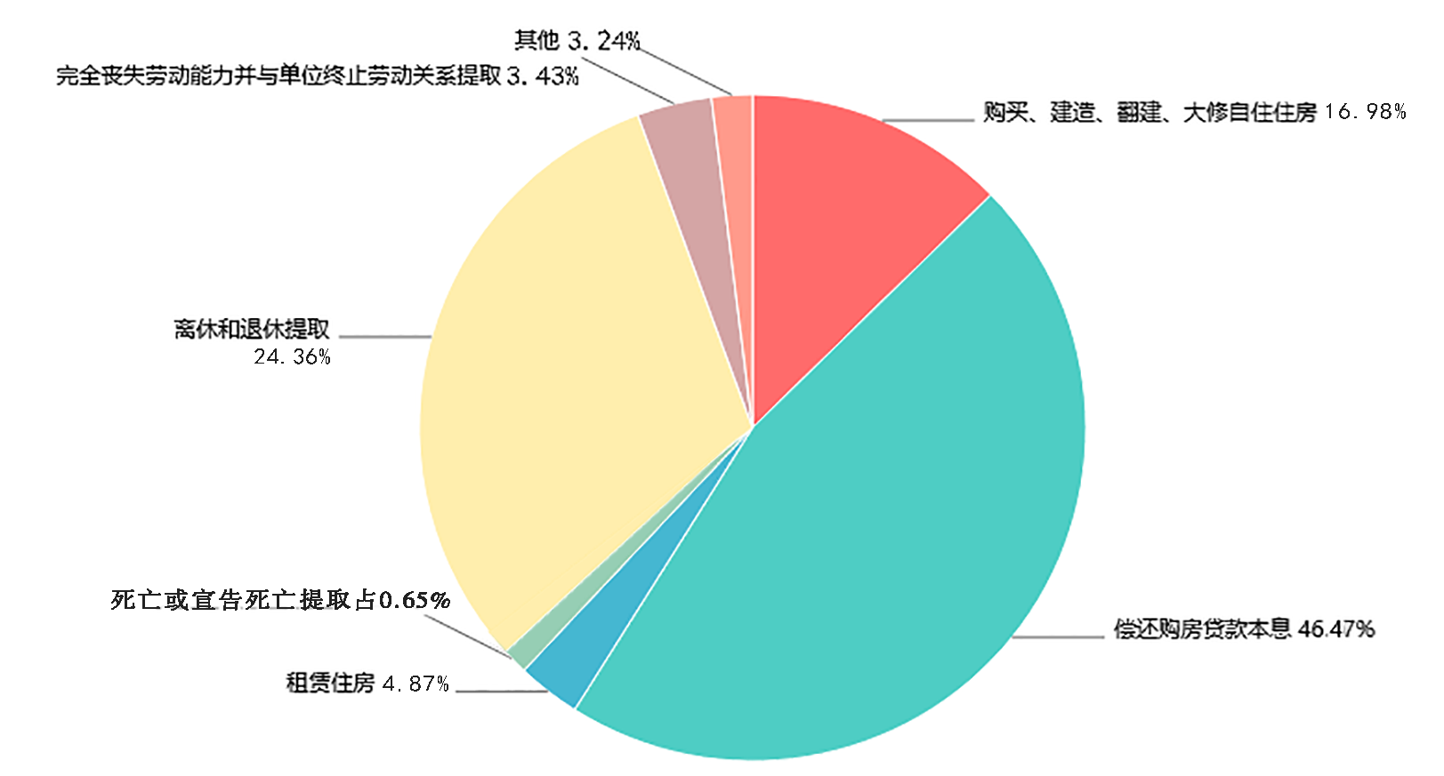 提取金额中,购买、建造、翻建、大修自住住房占16.98%,偿还购房贷款本息占46.47%,租赁住房占4.87%,老旧小区改造占0%,离休和退休提取占24.36%,完全丧失劳动能力并与单位终止劳动关系提取占3.43%,死亡或宣告死亡提取占0.65%,出境定居占0%,其他3.24%。